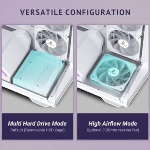 - Removable HDD Cage: Can be removed for installing 1x120mm fan.