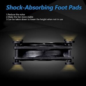 - Dimension: 4.92 X 4.92 X 1.81. Shockproof foot pads can make the fan lay flat or upright.