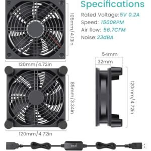 - USB Fan: Dimension: 120mm x 120mm x 25mm / 4.7×4.7×1 in. per fan; Rated Voltage:5V 0.2A; Speed: 1500RPM; Air flow: 56.7CFM; Noise:23dBA; Cable Length: 55cm Or 21 inches; Bearing: Sleeve ; Life: 35000 hours